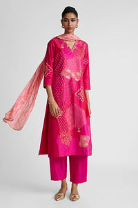 - Bandhani is a hand done process. Due to its technique of hand tie, there is no control over the size, distance or form of the dots. Any similarity or dissimilarity if purely a part of the process.