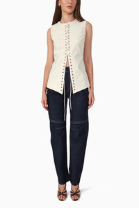 Embracing the essence of modern romance with a playful touch, the Top Eva was born. Crafted from smooth and stretchy fabric, it features lace-up detailing down the center front, adding a chic, corset-inspired accent to the design. It also comes in black, but only by request via DM.