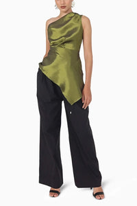 Top Pavline from deWAR introduces a captivating mix of glamorous eveningwear and contemporary allure. Draped from delicate woven crepe, it features an asymmetric hem and a striking one-shoulder neckline. The form-fitting bodice, enhanced by a gracefully pleated side drape, adds fluidity and sophistication to your every movement. Pair it with a metallic clutch and strappy sandals to elevate the top’s bold, daring sophistication, making it the perfect choice for standout evening occasions.