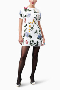 Introducing the Torin Dress, a vision of ethereal beauty and feminine grace, perfect for embracing the joys of summer. Crafted in pristine white, this enchanting dress is adorned with delicate floral sequin embellishments, each motif showcasing different summer hues.