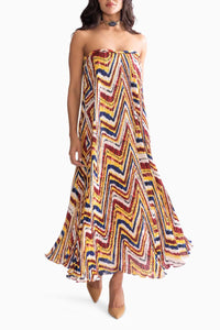 Featuring Tova Multi Dress by Saaksha & Kinni from Botanica Collection. A zigzag print strapless maxi dress with hand micro pleats, accentuating bold patterns and intricate texture for a dramatic and sophisticated look.