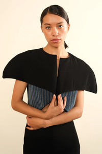 Featuring structured shoulders for a sharp, defined silhouette, the Transformed Cape Jacket is hand-embroidered with electric blue and white cords on the front and inner sleeves, adding depth and dimension. Designed for versatility, it is ideal for layering or as a standalone statement piece.