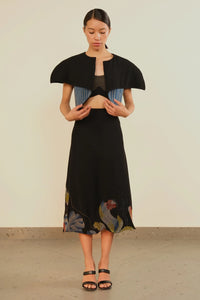 A striking ensemble featuring a structured top with electric blue and white hand embroidery, paired with a mid-length black skirt adorned with sculptural floral embroidery. Crafted for versatility and movement, this look balances bold detailing with elegant formâ€â€Âperfect as a layered outfit or a standout statement.