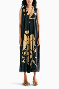 This black floral scatter printed jumpsuit features a front zipper opening and a V neckline, designed in a classic A-line silhouette for a flattering fit. Crafted from soft, breathable cotton mul, it ensures both comfort and style. The jumpsuit is fully lined for a smooth, comfortable finish and includes side seam pockets for added practicality, making it both chic and functional.