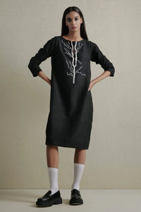 The Tree Dress features a striking pattern inspired by the roots of a tree, symbolizing strength and grounding. Crafted from handwoven black cotton, its structured silhouette and thoughtful detailing reflect timeless elegance and meaningful design