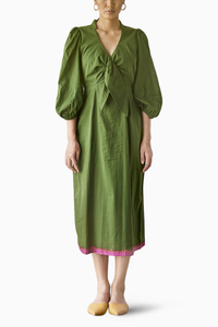 Featuring a dark green mul dress with a tie-up detailing at the front, side zip, and an elasticated sleeve hem. Comes with a pink dip-dyed hemline.