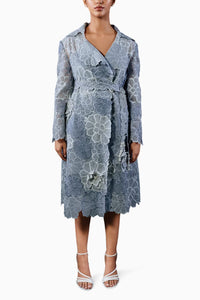 Featuring a trench coat that pays tribute to our signature vignette motif, this piece is crafted from a delicate tulle base fabric. The coat is adorned with intricate floral embroidery details that add a touch of elegance and artistry to its design. Complementing the exquisite embroidery is a matching embroidered belt, which cinches the waist and enhances the coat’s refined silhouette. This trench coat blends classic tailoring with intricate, artistic elements, making it a standout choice for those who appreciate both sophistication and creative flair.