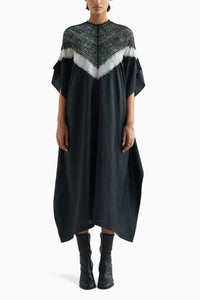 Elevate your style with our free-size silk kaftan, featuring a unique and striking shibori triangle-shaped neckline. Dyed in a classic black color, this kaftan captures a modern yet timeless elegance. The free-size design ensures a graceful fit for various body types, offering both comfort and sophistication. Perfect for adding a splash of vibrant color to any occasion, this kaftan combines innovative design with luxurious silk for a look that's both fresh and refined.