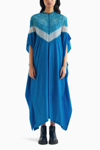 Elevate your style with our free-size silk kaftan, featuring a unique and striking shibori triangle-shaped neckline. Dyed in an all-new methyl blue, this kaftan captures a modern yet timeless elegance. The free-size design ensures a graceful fit for various body types, offering both comfort and sophistication. Perfect for adding a splash of vibrant color to any occasion, this kaftan combines innovative design with luxurious silk for a look that's both fresh and refined.