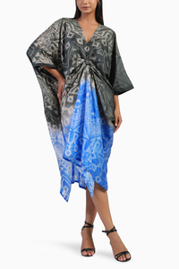 Featuring the Black and Blue Ombre Tribal Shibori Dress, this piece is a standout choice for any occasion. The dress showcases a striking v-neckline and a central front knot, adding a touch of elegance and contemporary flair. The ombre effect transitions beautifully from black to blue, enhanced by the tribal Shibori pattern, creating a visually captivating design.
