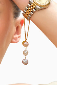 The Triplet Watch Charm features a striking combination of natural pearls in white, purple, and orange, accented by a delicate gold chain. Made from hypoallergenic brass and plated with 22k gold, this charm adds a vibrant and elegant touch to your watch or jewelry collection.