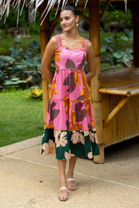 The Tropical and Vibrant Printed Midi Dress features a nature inspired design and an easy breezy fit. With its striking print and flowy silhouette this dress from The Golden Haze Collection is perfect for sunny days and warm nights.
