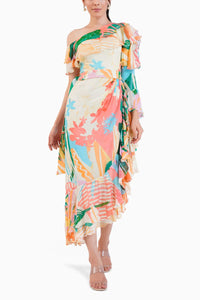 Featuring the Tropical Crush Printed One Shoulder Dress by Mandira Wirk's Waves of Love Collection. This vibrant chiffon dress showcases a stunning multi-colour tropical print and elegant frill details, making it the perfect choice for a chic and stylish summer outing. Embrace your bold side!