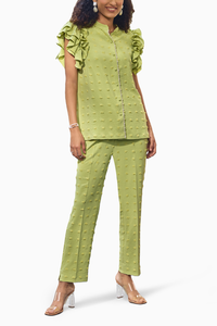 This co-ord is gonna be your go to go this season, Exaggerated ruffles on the shoulder giving that perfect ounce, Ban collar with front button opening