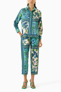Tropical-inspired printed pant set in shades of teal, blue, and green with asymmetric placement detail. The shirt has a concealed button placket, side slits and metallic button closure at the cuff. Paired with matching straight fit pants. Elasticated at the waist.