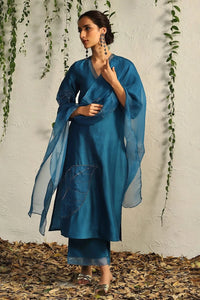 This true blue kurta set in a straight silhouette with side slits and beautiful scalloped neckline is elegant and enchanting. Designed with intricate nakshi and zari antique silver hand embroidery , this contemporary ensemble is ideal for your festive celebrations. Paired with scalloped edge flared pants and a dreamy pure organza dupatta adorning nakshi hand work.