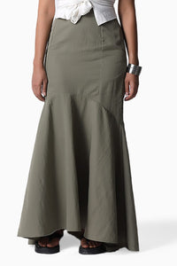 The Trumpet Skirt A draped skirt that flares at the bottom with a shorter front and a longer back.