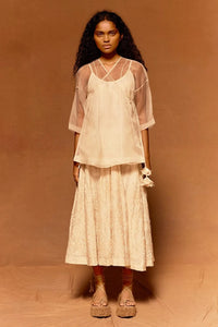 The Tsuru Angrakha, paired with a printed cotton slip,combines graceful overlapping panels with delicatehandmade floral tie-ups. This airy, effortlessly stylishpiece offers both comfort and charm, making it idealfor relaxed, everyday wear. The design captures the