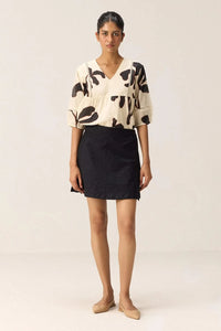 Featuring a soft off-white cotton mul top featuring an abstract black print. It has delicate lace detailing on the front bodice, sleeves, and hem. Fully lined for comfort and made with lightweight, breathable fabric.