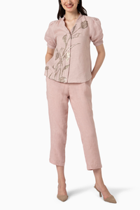 A slight ruffle detailed v-neck top adorned with zari stitch line along the hems with gathered 3/4th puff sleeves. Hand screen printed with numerous layers of screen meticulously printed each stroke of an abstract tulip motif in shades of grey with a touch of gold using heat-pressed foiling craft.
