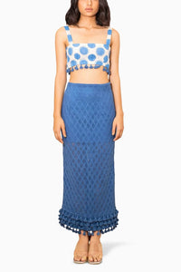 Featuring the Turin Blue Polka Crochet Skirt Set by Kalakaari by Sagarika Singhvi a breezy cotton co-ord with a handblock printed polka dot blouse and a delicate blue crochet skirt. Finished with a square neckline for a touch of vintage charm.