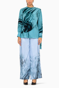 SHA Turquoise Blue Drape Top by Shasha Gaba from the Pret collection offers a contemporary Indowestern look in vibrant turquoise. Crafted from soft viscose crepe with elegant draping, its regular fit ensures effortless style, perfect for festive events or modern daytime dressing.