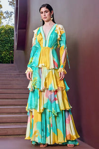 This elegant, four-layered long dress features a flattering V-neck, delicate frilled sleeves, and an elasticated waist, creating a dreamy, feminine silhouette perfect for effortless resort style.