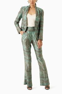 This two-piece set from Kartikeya brings sharp tailoring and refined chicness it's a perfect balance between smart-casual and formal. The peaked lapels bring an elegant finishing touch to the design with it's constructed silhouette. It is paired with matching bell bottom pants artfully drape and fall beautifully over the body.Dress this set up with point-toe pumps for important meetings and events.