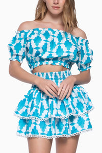 The perfect combination of prints and ruffles, Jenna is the must-have top of the season, offering adjustable elastic at the top and bottom for a customizable fit. Wear it as a crop top or keep your shoulders covered  the choice is yours. Paired with the Paulina skirt, featuring a smocked belt that flatters every silhouette, this chic, romantic, and bohemian look is a wardrobe essential.