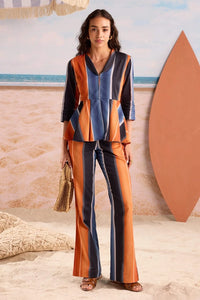 Elevate your style with this sophisticated Tuscany Co-ord Set, featuring bold vertical stripes in warm orange, navy blue, and white. The tailored peplum top with a V-neckline and the high-waisted flared trousers create a flattering silhouette, perfect for both daytime outings and evening events. Pair with minimalistic sandals, a woven clutch, and gold hoop earrings for a refined yet effortless look.