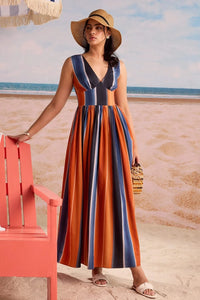 Make a statement in eye-catching Tuscany Maxi Dress, featuring bold vertical stripes in warm orange, navy blue, and white hues. The deep V-neckline, elasticated back and fitted bodice accentuate your silhouette, while the flowing skirt creates graceful movement—perfect for beachside strolls or summer gatherings. Complete the look with white slides, a woven sunhat, and a straw handbag for a chic, vacation-ready vibe.