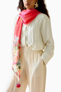 All the natives come together in a picturesque setting captured on this versatile-to-pair stole, where each one makes space for another, where the true beauty lies in the diversity, resembling a sundowner in the wild origins.