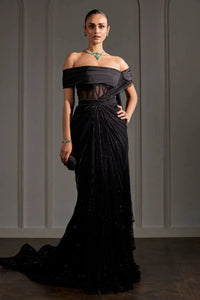Featuring a black draped saree paired with a boning blouse and galaxy-inspired embroidery, adding a celestial shine to the garment for a bold, modern statement.