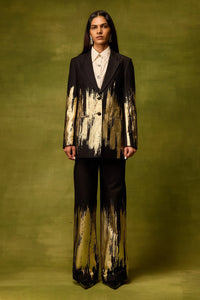 A power-dressing essential with a bold twist. This tailored longline blazer in black denim features dramatic gold foil detailing across the body and sleeves. Designed with a sharp lapel and button fastening, it offers versatility—wear it as a statement jacket or style as a blazer dress for impactful evenings.