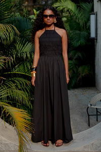 The Twine Dress is a graceful cotton silhouette with a ruched bodice and halter neckline. It ties at the back of the neck and waist, creating a soft, open-back detail. The flared hemline flows with ease, an effortless piece for sunlit days and slow evenings.