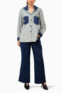 Blue corduroy hooded overshirt with floral detail and contrast pockets
