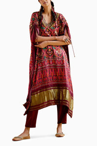 Maroon Kaftan in digital printed Patola deisgn with peacock motifs and ghungroos embellished V neck, and tie-up detailing on the shoulders with ghungroos to create a stunning look!