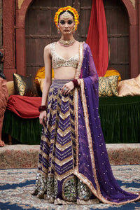 Purple linen lehenga features a chic chevron print is paired with mirror work blouse on gota lined with chanderi silk and matching organza dupatta with gota border.