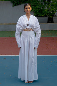 The Uma Top and Cina Skirt set, crafted from crisp cotton, blends sculptural elegance with everyday ease. The Uma Top features voluminous sleeves and a drawstring waist for a cinched silhouette, while the Cina Skirt offers soft structure with a sculpted yoke and gentle gathers. Worn together, they create a modern, monochrome look with understated drama.