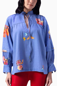 The UmiTop is a periwinkle blue cotton satin top with an Eden print with timeless red dot details on the yoke and sleeves. The neckline and cuffs are embellished with glass beads secured with red thread.