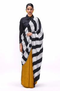A colour-block handwoven silk check saree with contrast pleats. The pallav and body of the saree is dyed using the traditional technique of leharia. The saree is handwoven on a traditional loom and is designed to move from mustard in the pleats to a checkered body while weaving. It comes with an unstitched mustard silk blouse piece.