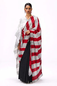 A colour-block handwoven silk check saree with contrast pleats. The pallav and body of the saree is dyed using the traditional technique of leharia. The saree is handwoven on a traditional loom and is designed to move from black in the pleats to a checkered body while weaving. It comes with an unstitched black silk blouse piece.