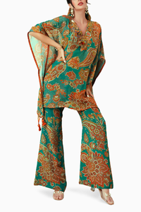 The Blue Printed Organza V-Neck Embellished Kaftan with Bellbottom Pants and Bustier features a flowing silhouette crafted from delicate organza fabric, adorned with intricate prints that add depth and allure. Its V-neckline is embellished with exquisite embroidery or embellishments, creating a focal point that enhances its graceful design. Paired with the kaftan are Bellbottom Pants, which offer a dramatic flair and complement the kaftan's flowing silhouette. The pants feature a fitted waist that flares out into wide legs, creating a striking contrast and adding movement to the ensemble.