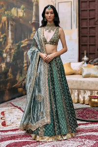 Composition: Blouse- Brocade and Cotton Cambric, Lehenga- Brocade and Cotton Cambric, Dupatta- Tissue and Velvet Color: Green Components: 3 Product Code: SVEITRHBR38