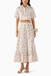 A romantic co-ord set featuring a lilac floral print on a white base, with a ruffled crop top and a flowing midi skirt. The delicate print and soft silhouette evoke effortless elegance. Lightweight fabric enhances movement. A dreamy, feminine ensemble perfect for any occasion.