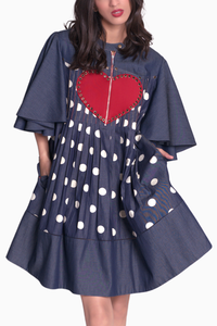 Featuring Vanessa Polka Denim Dress by Chillosophy from Confetti Collection. This short anti-fit dress adorns exaggerated flared sleeves in polka dot denim. It has a front zip closure with a large heart detail adorned with stud rings, colorful stitching along front pleats, pleated skirts with large pockets, and a round collar with a brass button.