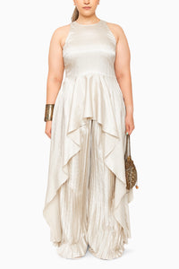 A sleeveless soft cream kurta inspired top with a fitted bodice and an asymmetrical high-low hem. Paired with a high-waisted wide-leg pants, featuring fine pleats for texture and movement. Crafted from lightweight fabric, it offers a graceful silhouette—ideal for formal or semi-formal occasions.