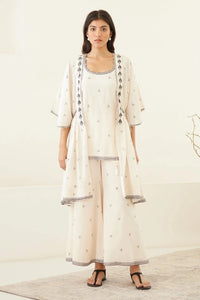 Featuring Vanilla White Tunic Set by Cotton and Clay, a graceful hand block printed ensemble in silk voile and modal. The gathered front open tunic, paired with a sleeveless inner top and flared hem trousers, is adorned with French knots and Mother of Pearl sequins—radiating timeless elegance in vanilla white with beluga black print.