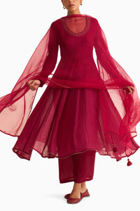 Chanderi kurta carries grace in its luxurious gheras and myriad kalis , stitched keenly together paired with soft cotton silk pants. The organza dupatta adds a texture of grace and makes it a formal ensemble.