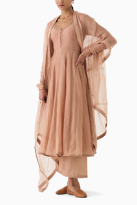 Featuring Vara Old Rose Ghoomar Anarkali Set by DOT. This Kurta Set with Dupatta is crafted from Chanderi, Cotton Silk, and Organza in Pink. Tailored for a perfect fit, it exudes elegance and grace.